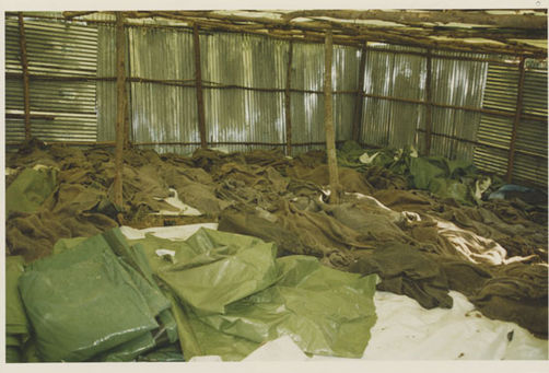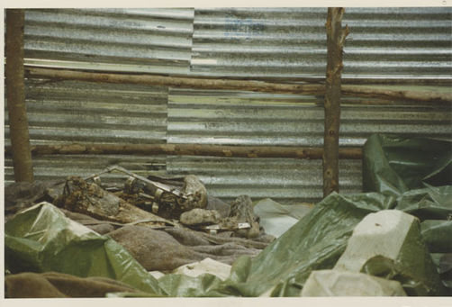 | Description: | Photograph of the interior of a room made from corrugated metal and wooden poles. Green tarps are laying on the ground. Decomposing legs wearing a pair of leg braces, complete with shoes, is laying next to the tarps. |