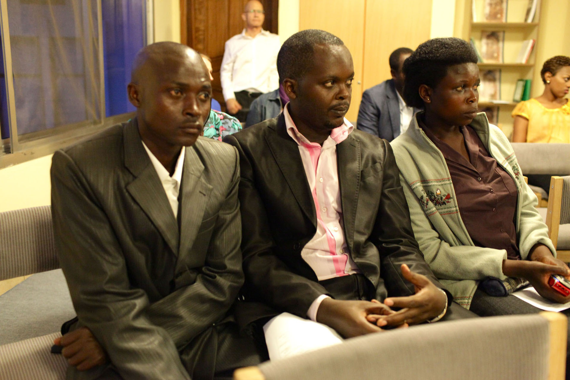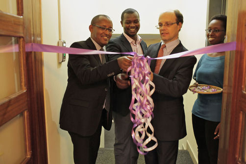 Freddy, Bideri and a Canadian Embassy representative cutting the ribbon at the inauguration of the Peace Room