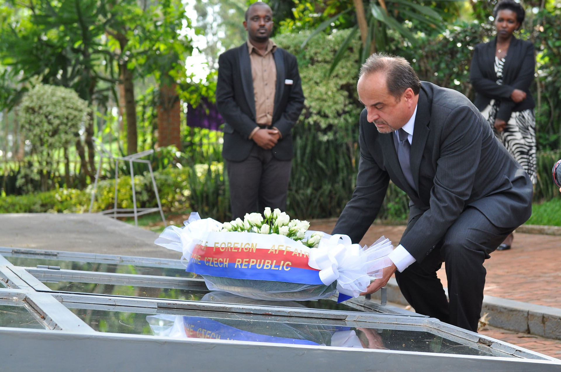 | Description: | Czech Foreign Minister, Jan Kohout, paying his respect with flowers at the Kigali Genocide Memorial Center Mass Graves. |