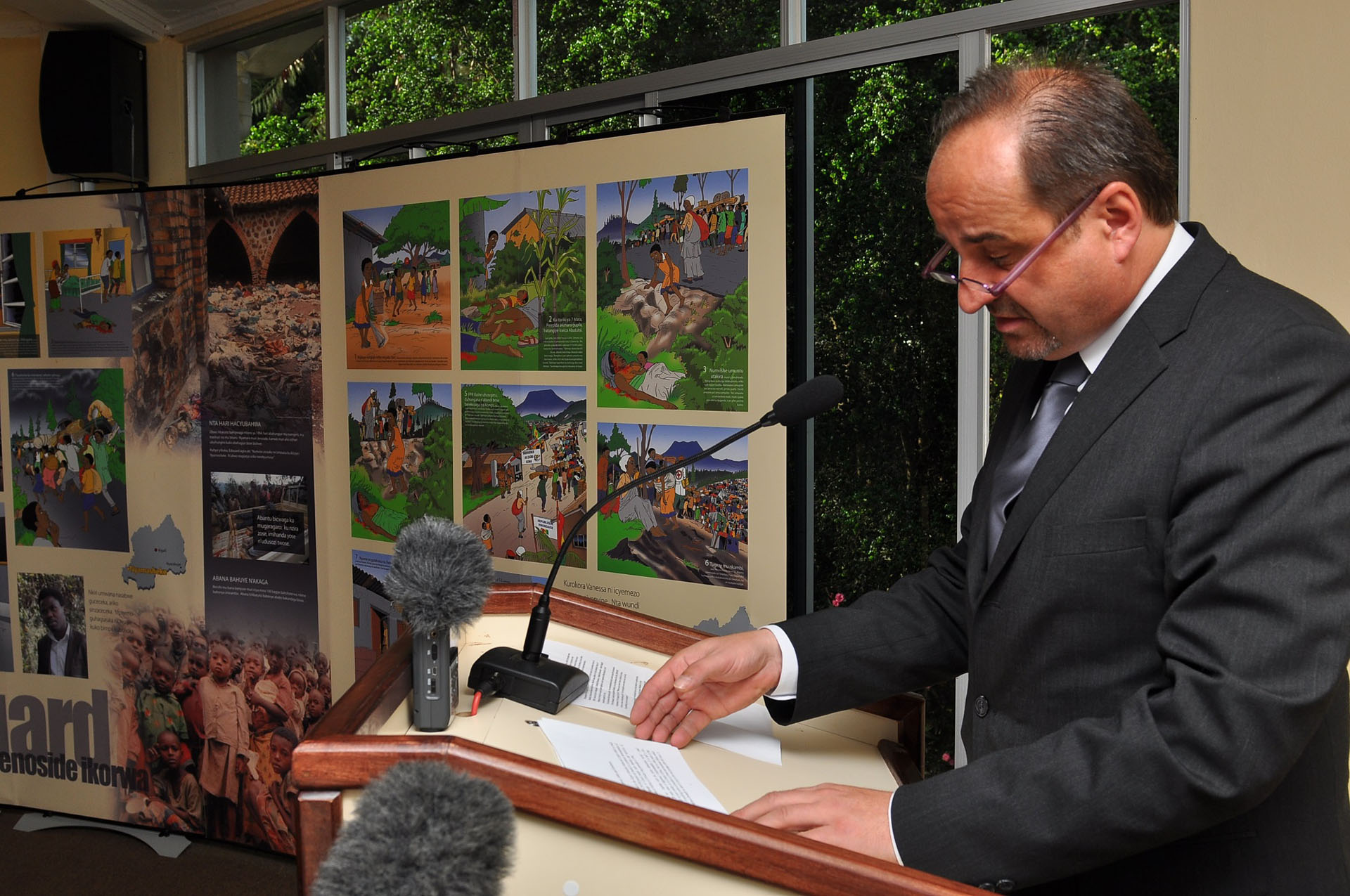 | Description: | Czech Foreign Minister, Jan Kohout, giving a speech after visiting the Kigali Genocide Memorial Center exhibitions & the education outreach mobile exhibitions |