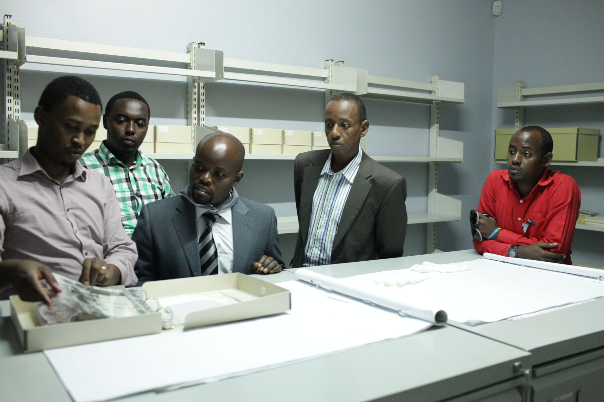 | Description: | Kamuronsi Yves explaining to the minister Jean Philbert Nsengimana the work of Physical Archive |