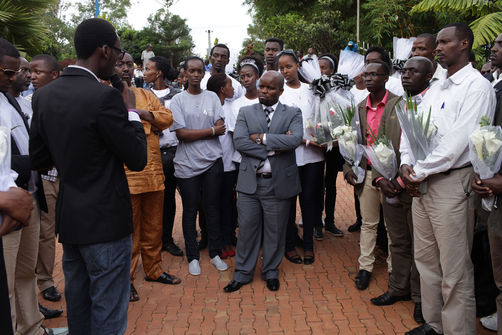 | Description: | Minister Jean Philbert Nsengimana, Miss Rwanda 2012 Aurore Mutesi Kayibanda, and various artists paying their respect at a mass grave at the Kigali Genocide Memorial. |