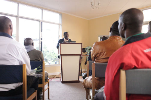 | Description: | Photograph of Freddy Mutanguha speaking at the mobile exhibition in Peace room at KGMC |