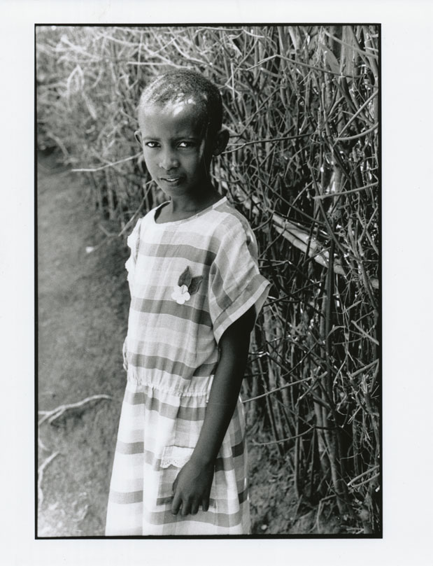 | Description: | Black and white photograph of a child standing in front of a fence made of sticks. African Rights survivor photographic project. |