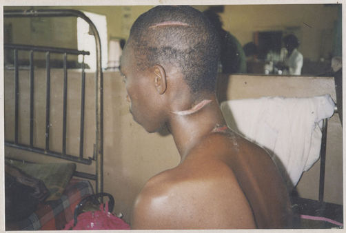 | Description: | Photograph of a person with three healing machete wounds on the head and neck. |
