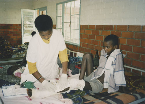 | Description: | Photograph of a boy sitting on a bed having his leg bandaged by a female nurse. |