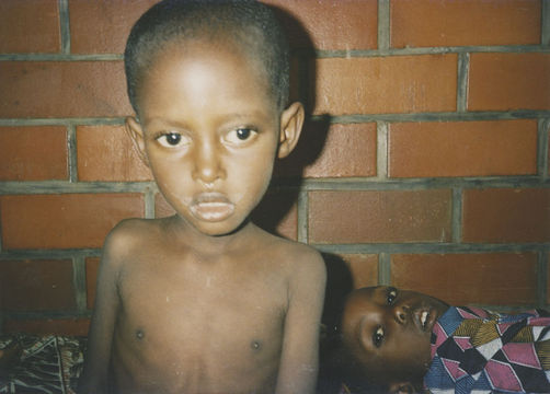 | Description: | Photograph of an emaciated child sitting on a mattress. |