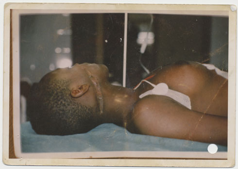 | Description: | Photograph of a bare-chested woman laying on her back with a healing machete wound along her cheek and neck and under her ear. She has monitors taped to her chest. |