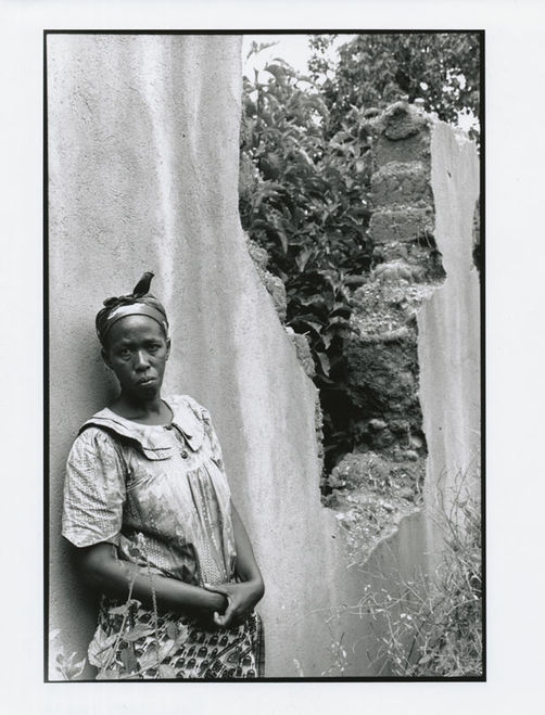 | Description: | Black and white photograph of a woman standing in front of a damaged wall. African Rights survivor photographic project. |
