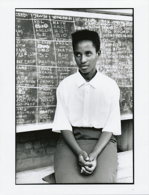 | Description: | Black and white portrait of a girl sitting in front of a blackboard. African Rights survivor photographic project. |