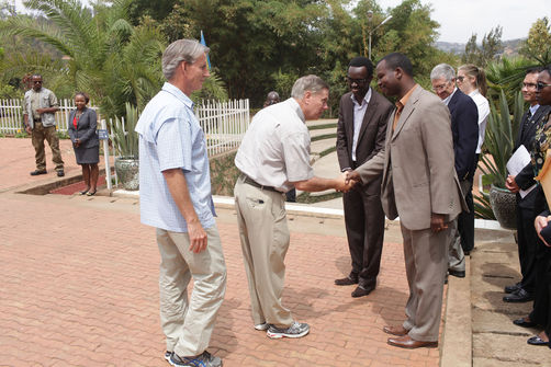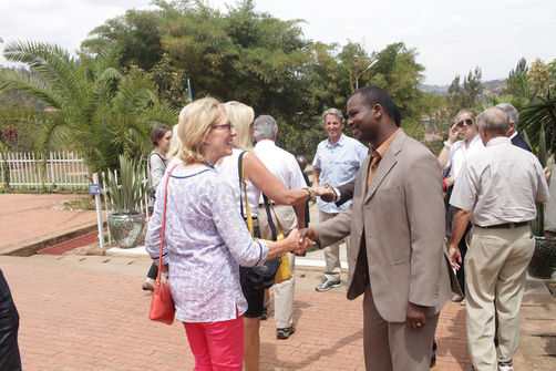 Aegis Trust Rwanda Country Director Freddy Mutanguha and Kigali Genocide Memorial Center Manager Honore Gatera welcome U.S. Senators to the Kigali Genocide Memorial Center