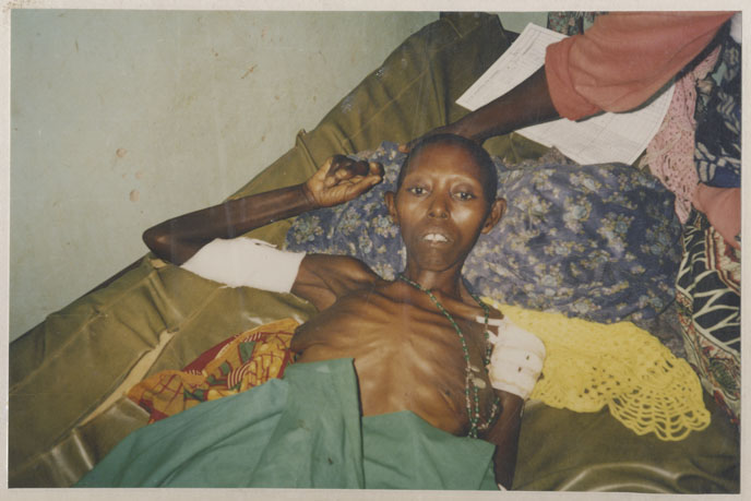 | Description: | Photograph of an emaciated woman laying on her back with bandages on her left shoulder and right arm. |