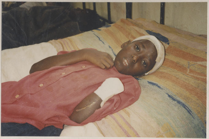 | Description: | Photograph of a child laying on their back on a bed with their head and left hand bandaged. |