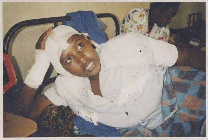 | Description: | Photograph of a woman laying on her side in a bed. Her head and right wrist are bandaged. |