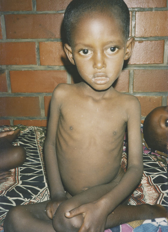 | Description: | Photograph of an emaciated child sitting on a mattress. |